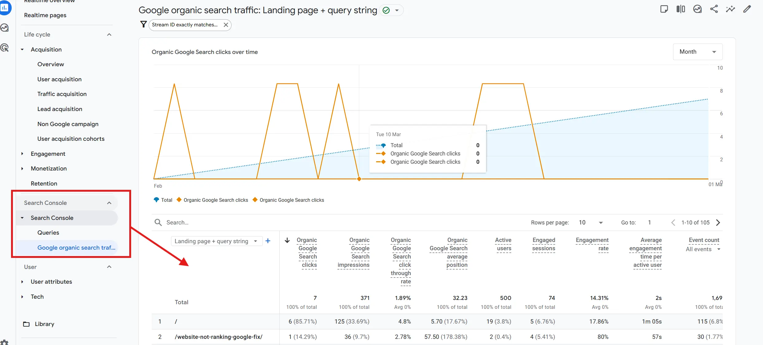 If you have linked Search Console, you can also open the Google organic search traffic report. That report shows landing pages with their Search Console and Analytics metrics. If you cannot see it, go to the Library in GA4 and publish it from there. That report is useful when you want to see which pages get organic visits and which devices or countries those visits come from.